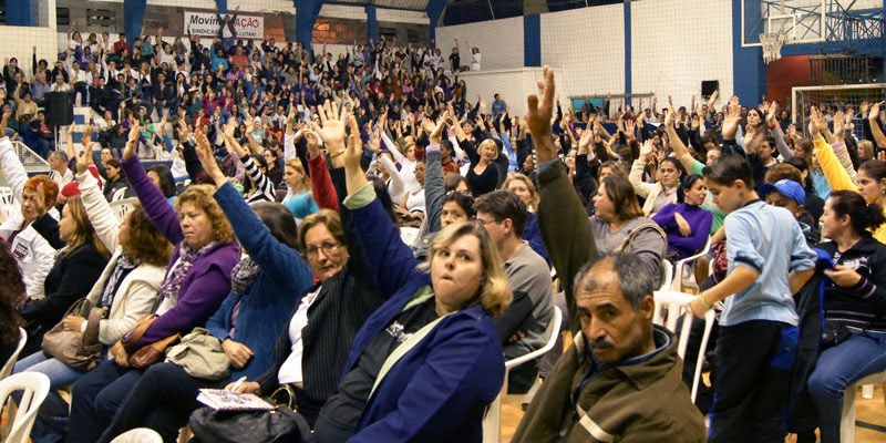 Servidores lotaram o Ginásio Abel Schulz na Assembleia Geral desta terça-feira e deliberaram pela greve geral da categoria. Os trabalhadores negaram a proposta da Prefeitura de reajuste parcelado e votaram a instalação da greve, com a primeira paralisação programada para o dia 13 de julho, quando os servidores realizarão uma nova assembleia às 8h da manhã, em frente a Prefeitura. Até lá o Executivo Municipal terá uma nova chance apresentar uma proposta coerente para então discutir com a categoria. Não havendo negociação, os trabalhadores tem data marcada para a paralisação total das atividades, iniciando a greve geral do funcionalismo em 2 de agosto, sem previsão de retorno.