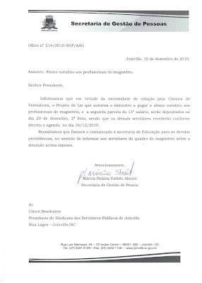 A secretaria de gestão de pessoas enviou nesta quarta-feira (15) um ofício confimando que o pagamento do abono natalino do magistério será realizado no dia 20 de dezembro, junto com a segunda parcela do 13º salário. Os demais servidores recebem a segunda parcela no dia 16 de dezembro.
